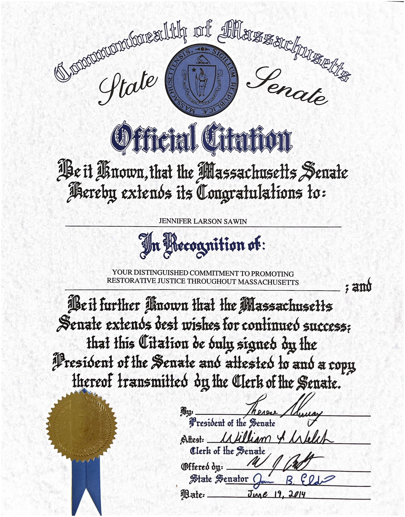 Over eight years, a colleague and I wrote and advocated for the bill among legislative sponsors, staffers, agencies, practitioners, victim advocates, caucus members, and criminal justice representatives. The Boston Marathon bombing in 2013 was an especially tricky time to be advocating for new ideas in the justice arena. Some language changed. Most of it stayed the same. Hundreds of coalition meetings, info sessions, and legislative breakfasts later — seriously, fist-name basis with statehouse security — the law passed in April 2018 (“An Act Relative to Criminal Justice Reform” §276B) 37-0 in the Senate and 148-5 in the House. Co-sponsor senators awarded me a “State Citation” for work on this legislation and restorative justice broadly. Knowing that everyone in the state affected by crime can access restorative justice? It makes all that “sausage making” 100% worth it.